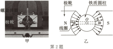 2. (2025·浙江温州期末)如图甲为磁电式电流表的结构图,极靴和铁质圆柱间的磁场分布如图乙所示,磁感应强度大小只与到转轴的距离有关。测量某恒定电流时,线圈$a$、$b$两边的电流方向如图乙所示,则下列说法正确的是
