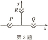 3.A 解析:由安培定则可知,通电直导线P、Q在R处产生的磁场方向如图,则合磁场的方向水平向右,即沿x轴正方向,则R处的磁场方向沿x轴正方向;由左手定则可知,通电直导线R所受安培力垂直于R指向y轴负方向,选项BCD错误,A正确。