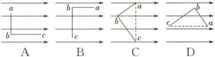 4. (2025·河北张家口一模)如图所示,通电折线$abc$的两段$ab\bot bc$($ab<bc$),匀强磁场水平向右,将此通电折线$abc$放入磁场中,下列情况其所受安培力最大的是 (