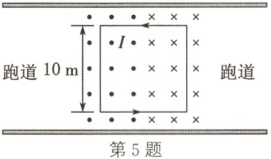5. 现代科技 (2024·江苏盐城期中)为缩短固定翼飞行器着陆后的滑行距离,有人构想在机身和跑道上安装设备,使飞行器在安培力作用下短距着陆,如图所示,在机身上安装长为$10\ {m}$、匝数为$50$匝的矩形线圈,线圈通以$100\ {A}$的电流,跑道上有大小为$0.3\ {T}$的磁场,通过传感器控制磁场区域随飞机移动,使矩形线圈始终处于图示磁场中,忽略电磁感应的影响,线圈所受安培力的大小和方向是 (