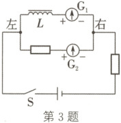 3.A 解析:电路稳定后断开,通过电阻这一支路的电流立即消失,由于电感器对电流的变化有阻碍作用,会阻碍其减小,通过电感器的电流会通过电阻。所以含有电感器的支路的电流从“+”接线柱流入,$G_1$表指针向左偏。含有电阻的支路电流从“-”接线柱流入,$G_2$表指针向右偏,选项A正确。