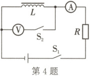 4.B 解析:若先断开开关$S_1$,再断开开关$S_2$,则由于线圈中电流突然减小,则会产生很大的自感电动势加在电压表两端,可能会毁坏电压表,他的操作步骤不正确,应先断开开关$S_2$,确保电压表安全,选项B正确。