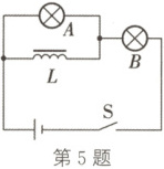 5.C 解析:开关S闭合瞬间,L产生很大的自感电动势阻碍其电流增大,此时L可视为断路,所以A、B中同时有电流通过,即两灯同时亮,随着L的自感电动势逐渐减小,通过A的电流逐渐减小,A逐渐变暗,通过B的电流逐渐增大,B逐渐变亮,最后电路稳定时,A被短路所以处于熄灭状态,而B灯比开始时更亮,选项C正确。