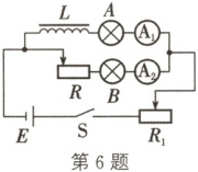 6.D 解析:闭合开关S瞬间,灯泡B立刻变亮,与灯泡A串联的线圈产生自感电动势,导致灯泡A逐渐变亮,所以电流表$A_1$示数小于$A_2$示数,选项AB错误;断开开关S瞬间,线圈相当于电源放电,灯泡A与灯泡B所在支路形成闭合回路,因为断开前两支路电流相等,所以断开瞬间两灯不会先闪亮一下,再熄灭。而稳定后电流表$A_1$和$A_2$中电流方向相同,指针偏转方向相同,断开开关S瞬间,在新的回路中电流表$A_1$的指针偏转方向不变,电流表$A_2$指针偏转方向反向,所以断开S瞬间,电流表$A_1$和$A_2$指针偏转方向相反,选项C错误,D正确。