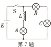 7.D 解析:闭合开关S的瞬间,由于自感线圈的阻碍作用,使得电流逐渐变大,灯A慢慢变亮,B、C立即亮,选项AB错误;断开开关S的瞬间,右侧形成闭合回路,由于自感线圈对电流的阻碍作用,使通过A的电流慢慢变小,因为自感线圈直流电阻与灯泡电阻相同,所以断开开关前通过三个灯泡的电流相同,断开开关S瞬间,三个灯泡电流大小相同,且同时逐渐变暗,选项C错误,D正确。