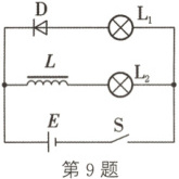 9.D 解析:当S闭合时,因二极管加上了反向电压,二极管截止,故$L_1$不亮;而此时通过线圈的电流增大,由于自感电动势阻碍电流的变化,故$L_2$的亮度逐渐变亮,选项AB错误;当S断开时,由于线圈中的电流减小,故其中产生自感电动势阻碍电流减小,故电流从右向左流过$L_1$,故$L_1$突然变亮,之后,两灯逐渐熄灭,选项C错误,D正确。