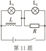 11.D 解析:闭合开关瞬间,两灯泡瞬间通电,瞬间变亮,由于线圈的自感,通过线圈的电流为0,即通过灯泡$L_1$的电流等于通过灯泡$L_2$的电流与通过电阻R的电流之和,则$L_1$比$L_2$更亮,选项AB错误;断开开关后,由于线圈的自感,线圈相当于一个等效电源,线圈与灯泡$L_1$构成新的回路,可知,断开开关后,$L_1$慢慢熄灭,$L_2$立即熄灭,通过$L_1$的电流从右向左,选项C错误,D正确。