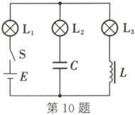 10.C 解析:闭合开关瞬间,电容器C相当于通路,线圈L相当于断路,所以$L_1$、$L_2$瞬间亮起,$L_3$逐渐变亮,选项A错误;闭合开关后,电容器充电,充电完成后相当于断路,所以$L_2$亮一下后熄灭,选项B错误;稳定后,电容器相当于断路,线圈相当于短路,所以$L_1$、$L_3$串联,所以一样亮,选项C正确;稳定后,电容器与$L_3$并联,两端电压等于$L_3$两端电压,由于线圈电阻和电源内阻忽略不计,且$L_1$、$L_3$串联,$L_3$两端电压为$\frac{1}{2}E$,根据$Q=CU$,可得电容器的电荷量等于$\frac{1}{2}CE$,选项D错误。