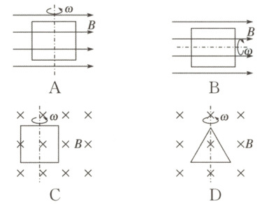 1. B 解析:B图线圈转动过程始终平行于磁场,磁通量始终为0,不能产生交变电流,选项B符合要求;A、C、D图线圈绕垂直于磁场的轴匀速转动,穿过线圈的磁通量发生变化,能产生交变电流,选项ACD不符合要求。
