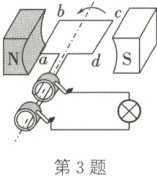 3. (2024·江苏常州期末)如图所示,线圈$abcd$在水平匀强磁场中匀速转动而产生交变电流。当线圈逆时针转动到图示水平位置时(