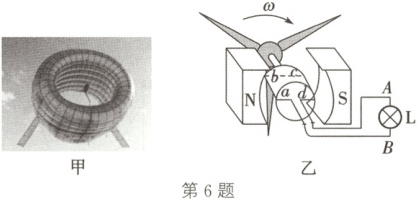 6. 现代科技(2025·福建漳州期末)(多选)图甲为气球带动下悬挂在高空中的风力发电机,可供地面临时用电,发电机的构造示意图如图乙所示,在图示位置时线圈$abcd$所在平面与磁感线平行。则线圈$abcd$转至图示位置时(