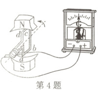 4. AC 解析:线圈在磁场中匀速转动时,在电路中产生呈周期性变化的交变电流,线圈经过中性面时电流改变方向,线圈每转动一周,有两次通过中性面,电流方向改变两次,指针左右摆动一次,选项A正确;线圈处于图示位置时,$ab$边向右运动,由右手定则,$ab$边的感应电流方向为$a \to b$,选项B错误,C正确;线圈平面与磁场方向平行时,磁通量为零,磁通量的变化率最大,选项D错误。