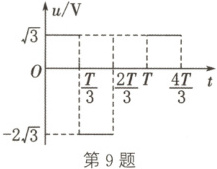 9. C 解析:根据交流电压有效值的定义可知$\frac{U^2}{R}T = \frac{(\sqrt{3} V)^2}{R} · \frac{T}{3} + \frac{(2\sqrt{3} V)^2}{R} · \frac{T}{3}$,解得电压的有效值为$U = \sqrt{5} V$,选项 C 正确。