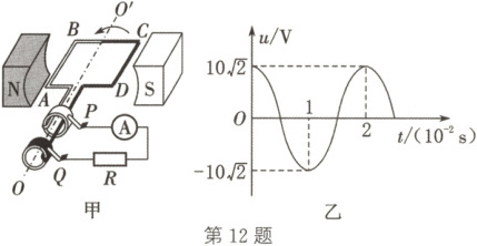 12. D 解析:交流发电机的工作原理是电磁感应,选项 A 错误;$t = 2 × 10^{-2} s$时,线圈产生的感应电动势瞬时值$u = 10\sqrt{2} V$,感应电流的瞬时值$i = \frac{u}{R} = \sqrt{2} A$,电流有效值为$1 A$,电路中电流表示数为$1 A$,选项 B 错误;交流电的周期$T = 0.02 s$,一个周期内电流方向改变 2 次,则每秒钟电流方向变化 100 次,选项 C 错误;线圈从题图甲所示位置开始计时,产生的电动势瞬时值表达式为$e = E_{ m}\cos \omega t = 10\sqrt{2}\cos(100\pi t) V$,选项 D 正确。