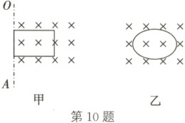10. (2024·山东菏泽期中)两个电阻相同、面积均为 $S$ 的单匝线圈,分别放在如图甲、乙所示的磁场中,图甲是磁感应强度大小为 $B_0$ 的匀强磁场,矩形线圈在磁场中以周期 $T$ 绕 $OA$ 轴匀速转动,转轴为磁场区域左边界;图乙磁场变化规律为 $B = B_0\cos\frac{2\pi}{T}t$。