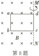 8. (2025·河北邢台三模)如图所示,竖直虚线 $MN$ 为垂直纸面向里的匀强磁场右边界,单匝矩形线圈 $abcd$ 的 $cd$ 边与 $MN$ 重合。线圈绕 $MN$ 轴以角速度 $\omega$ 匀速转动,从图示位置开始计时,已知磁感应强度大小为 $B$,线圈的面积为 $S$。则线圈中(