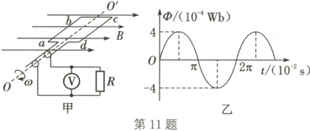 11. (2025·江苏连云港联考)如图甲所示的电路中,交流发电机线圈的匝数 $n = 1500$,线圈电阻 $r = 1\Omega$,外接定值电阻 $R = 9\Omega$,线圈在匀强磁场中匀速转动时,穿过线圈的磁通量 $\Phi$ 随时间 $t$ 变化的图像如图乙所示,图甲中理想交流电压表的示数为(