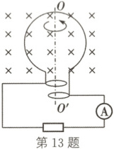 13. C 解析:感应电动势最大值$E_{ m} = NBS\omega$,$S = \pi r^2$,电动势瞬时值$e = E_{ m}\sin \omega t$,解得$e = NB\pi r^2\omega\sin \omega t$,选项 A 错误;图示时刻穿过导线框的磁通量$\Phi = B\pi r^2$,选项 B 错误;电动势有效值$E = \frac{E_{ m}}{\sqrt{2}}$,交流电流表的示数$I = \frac{E}{R}$,解得$I = \frac{NB\pi r^2\omega}{\sqrt{2}R}$,选项 C 正确;外电路电阻两端电压的有效值$U = IR$,解得$U = \frac{NB\pi r^2\omega}{\sqrt{2}}$,选项 D 错误。