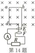 14. BC 解析:线圈转动的角速度$\omega = 2\pi n = 4 rad/s$,正弦交变电流电动势的最大值$E_{ m} = NBS\omega = 16 V$,电动势有效值$E = \frac{E_{ m}}{\sqrt{2}} = 8\sqrt{2} V$,由闭合电路欧姆定律得$I = \frac{E}{R + r} = \frac{2\sqrt{2}}{5} A$,选项 A 错误;发电机的输出功率等于外电路电阻$R$消耗的功率,有$P = I^2R = 6.08 W$,选项 B 正确;已知$t = 0$时刻,线圈平面与磁场方向垂直,所以感应电动势的瞬时值表达式为$e = E_{ m}\sin \omega t = 16\sin(4t) V$,当$t = \frac{\pi}{24} s$时,解得感应电动势的瞬时值为$e = 8 V$,根据闭合电路欧姆定律,此时输出电压的瞬时值为$u = \frac{R}{R + r}e = 7.6 V$,选项 C 正确;在$t = 0$到$t = \frac{\pi}{12} s$过程中,转过的角度为$\theta = \omega\Delta t = \frac{\pi}{3} rad$,磁通量的变化量为$\Delta\Phi = BS(1 - \cos \theta)$,根据$q = \frac{N\Delta\Phi}{R + r}$,解得$q = 0.1 C$,选项 D 错误。
