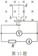 15. (选做题)(2024·江苏盐城期中)如图所示,线圈 $abcd$ 的面积是 $0.1 m^2$,共 $100$ 匝,线圈电阻为 $2\Omega$,外接电阻 $R = 8\Omega$,匀强磁场的磁感应强度为 $B = \frac{1}{\pi} T$,当线圈以 $300 r/min$ 的转速匀速转动时,求: