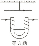 3.B 解析:根据安培定则可知,电磁铁线圈产生的磁场与蹄形磁体产生的磁场相同,作出其磁感线分布如图所示,在直导线左右两侧取两个对称的微元,根据左手定则可知,左侧微元受到的安培力方向垂直于纸面向外,右侧微元受到的安培力方向垂直于纸面向里,可知,从上往下看,直导线将沿逆时针方向转动。直导线转动过程中,导线逐渐趋于与纸面垂直,即电流方向垂直于纸面向里,导线在磁场中的有效长度逐渐增大,根据左手定则,该电流方向上的安培力方向向下,且大小逐渐增大,根据平衡条件可知,细线拉力增大。综上可知,从上往下看,导线沿逆时针方向转动,细线拉力增大,选项B正确。