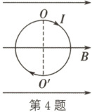 4.D 解析:根据左手定则可知,圆环右半边受到的安培力方向垂直磁场方向向外,左半边受到的安培力方向垂直磁场方向向里,因此俯视看,圆环有绕$OO^{\prime}$沿顺时针方向转动的趋势,选项ABC错误;将圆环绕$OO^{\prime}$转过$90^{\circ}$且固定时,两个半圆环受到的安培力等大反向,合力为零,选项D正确。