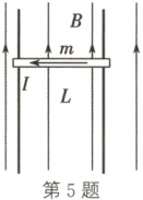 5. 如图所示,一质量为$m$、长度为$L$的通有恒定电流$I$的导体棒处于竖直向上的匀强磁场中,磁感应强度与时间的关系式为$B = kt$($k$为大于零的常数,取竖直向上为正方向),导体棒与竖直导轨间的动摩擦因数为$\mu$,重力加速度为$g$。当$t = 0$时,导体棒由静止释放,向下运动的过程中始终与导轨接触良好且水平,已知最大静摩擦力等于滑动摩擦力,且磁场空间足够大、导轨足够长,则导体棒的最大速度$v_m$为 (