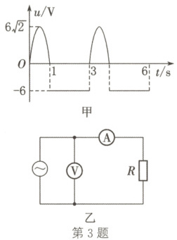 3.C 解析:电压表测量的是有效值,不是瞬时值。$t = 1s$时,虽然此时瞬时电压为0,但电压表显示的是整个交流电压的有效值,不为0,选项A错误;设此交变电流的电压有效值为U,根据有效值定义得$\frac{(\frac{6\sqrt{2}}{\sqrt{2}}V)^2}{R} · \frac{T}{3}+\frac{(6V)^2}{R} · \frac{2T}{3}=\frac{U^2}{R}T$,解得$U = 6V$,由闭合电路欧姆定律得电流表的示数为$I = \frac{U}{R}=0.5A$,选项B错误,C正确;由焦耳定律得电阻R一个周期内产生的热量为$Q = I^2RT = 9J$,选项D错误。