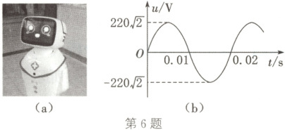 6. 现代科技 如图(a)所示的智能机器人广泛应用于酒店、医院等场所。机器人内电池的容量为$25\ 000\ mA·h$,负载$10\ kg$时正常工作电流约为$5\ A$,电池容量低于$20\%$时不能正常工作,此时需要用充电器对其进行充电,充电器的输入电压如图(b)所示。下列说法正确的是 (