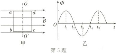 5. (2024·江苏苏州段考)如图甲所示,一个矩形线圈$abcd$在匀强磁场中绕垂直于磁场方向的轴匀速转动。线圈内的磁通量随时间$t$变化的图像如图乙所示,则下列说法中正确的是 (