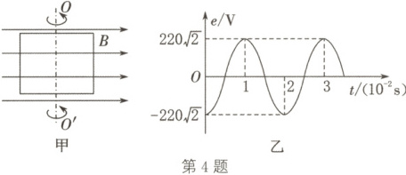 4.D 解析:$t = 0$时感应电动势最大,则线框处于与中性面垂直的位置,选项A错误;$t = 0.5 × 10^{-2}s$时感应电动势为零,则此时线框的磁通量变化率为零,选项B错误;线框的电动势有效值为$E = \frac{220\sqrt{2}}{\sqrt{2}}V = 220V$,选项C错误;交变电的周期为$0.02s$,一个周期内电流方向改变2次,可知线框中的电流方向每秒变化100次,选项D正确。
