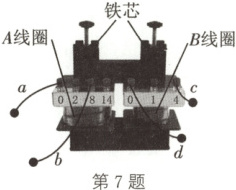 7. (2024·江苏扬州期中)如图所示,用可拆变压器探究原、副线圈电压与匝数的关系。$A$线圈“$0$”“$8$”接线柱间对应的匝数为$800$,通过导线$a$、$b$接$e = 24\sqrt{2}\sin(100\pi t)\ V$的正弦交流电;$B$线圈“$0$”“$4$”接线柱间对应的匝数为$400$,通过导线$c$、$d$接交流电压表,该表读数可能为 (