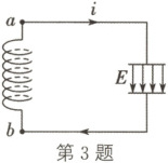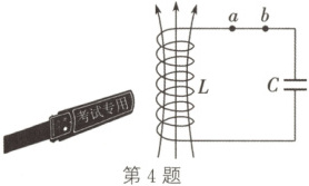 4. D 解析:某时刻,电流的方向由b流向a,且电流强度正在增强,说明电容器正处于放电的过程,可知该时刻电容器上极板带正电荷,下极板带负电荷,选项A错误;电流的方向由b流向a,且电流强度正在增强,可知电容器所带的电荷量在减小,则电容器的电场能在减小,线圈的磁场能在增加,选项B错误;电容器正处于放电的过程,电容器两端电压在降低,由E=$\frac{U}{d}$可知,电容器两极板间的电场强度正在减弱,选项C错误;电流的方向由b流向a,且电流强度正在增强,由电容器放电特点可知,电流强度增大得越来越慢,由自感电动势公式$E_{自}=L\frac{\Delta I}{\Delta t}$可知,线圈的自感电动势在减小,选项D正确。