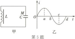 5. (2024·安徽芜湖期末)图甲表示$LC$振荡电路,如图乙所示为其电流随时间变化的$i-t$图像。在$t=0$时刻,回路中电容器的$M$板带正电。在某段时间里,回路的磁场能在减小,而$M$板仍带正电,则这段时间对应图像中 (