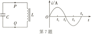 7. (2025·江苏无锡期中)如图所示是$LC$振荡电路和通过点$P$的电流随时间变化的规律。若把流过点$P$向右的电流方向规定为正方向,则下列说法正确的是 (
