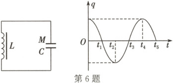 6. A 解析:开始时电容器M带正电,则在0~t₁时间内电容器放电,电流方向为逆时针方向,且电流增加,则磁场能增加;t₁~t₂时间内电容器充电,电流方向为逆时针方向,且电流减小,则磁场能减小;t₂~t₃时间内电容器反向放电,电流方向为顺时针方向,且电流增加,磁场能增加;t₃~t₄时间内电容器反向充电,电流方向为顺时针方向,且电流减小,磁场能减小,选项A正确。