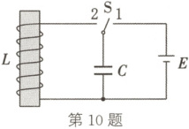 10. B 解析:由LC振荡电路的周期公式T=2π$\sqrt{LC}$,可得T=2π$\sqrt{50 × 10^{-6} × 2 × 10^{-6}}$ s = 2π×10⁻⁵ s,开关S接1时,电容器上极板带正电,开关S转接到2后开始计时,根据振荡电路特点和右手螺旋定则可知,在t=$\frac{3T}{4}$=$\frac{3\pi × 10^{-5}}{2}$ s时刻,电感L线圈内的磁场达到最大,且方向向上,选项B正确。