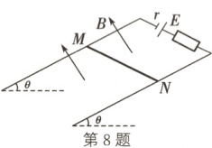8.D 解析:根据左手定则可知,安培力方向沿斜面向上,选项A错误;导体棒受到的安培力大小$F_{安} = BId = 0.5 × 0.8 × 0.6N = 0.24N$,选项B错误;由于$mg\sin24^{\circ} = 0.03 × 10 × 0.4N = 0.12N < F_{安}$,可知导体棒受到的摩擦力沿斜面向下,选项C错误;导体棒恰好能保持静止,根据受力平衡可得$mg\sin24^{\circ} + f = F_{安}$,解得$f = 0.12N$,又$f = \mu N = \mu mg\cos24^{\circ}$,解得导体棒与导轨间的动摩擦因数$\mu = \frac{4}{9}$,选项D正确。