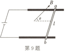 9.D 解析:金属杆$ab$所受安培力大小为$F_{安} = BIl$,选项A错误;根据左手定则,安培力方向垂直B、I构成的平面,斜向左上方,选项B错误;金属杆$ab$受到的摩擦力$f = BIl\sin\theta$,方向水平向右,选项C错误;根据受力平衡和牛顿第三定律,金属杆对导轨的压力大小为$N = mg - BIl\cos\theta$,选项D正确。