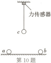 10.(2025·山东青岛段考)三根平行长直导线$a$、$b$、$c$中均通有恒定电流,导线$a$、$b$固定在水平面上,导线$c$通过轻质绝缘细线与力传感器相连,截面图如图所示,此时导线$c$处于静止状态且力传感器的示数恰好为零,下列说法正确的是 (