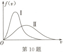 10 D 解析:由两曲线可知,高温状态下分子速率大小的分布范围相对较大,选项A错误;温度越高,分子平均动能越大,速率高的分子所占的比例大,故曲线Ⅱ对应的温度高,选项B错误;速率都呈正态分布,中间速率的分子最多,选项C错误;不同温度下,同一速率分子所占比例不同,速率分布区间不同,选项D正确。