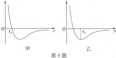 9.D 解析:根据图像可知,$r_0$为平衡位置时分子之间的间距,在此位置,分子力为0,分子势能最小,可知,甲图像为分子力与分子间距离的关系图像,选项A错误;根据图甲可知,当分子间距离从$0.9r_0$增大到$10r_0$的过程中,分子力先变小再变大之后变小,选项B错误;根据图甲可知,当分子间距离从$0.9r_0$增大到$10r_0$的过程中,分子力先表现为斥力,后表现为引力,则分子力先做正功再做负功,选项C错误;结合上述可知,乙图像为分子势能$E_p$与分子间距离r的关系图线,则当分子间距离从$0.9r_0$增大到$10r_0$的过程中,分子势能先变小再变大,选项D正确。