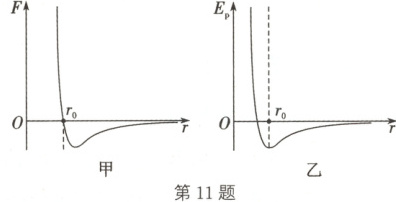 11.AD 解析:两分子间距为$r_0$时,两分子既受到引力也受到斥力,但引力和斥力等大反向,合力为0,选项A正确;由图乙可知,两分子间距为$r_0$时,分子势能最小,此时B受到的分子间作用力为0;两分子相距无限远,分子势能为零,不是最小,选项B错误,D正确;在$r>r_0$阶段,分子力F表现为引力,相互靠近时,F做正功;在$r<r_0$阶段,分子力F表现为斥力,F做负功,选项C错误。