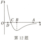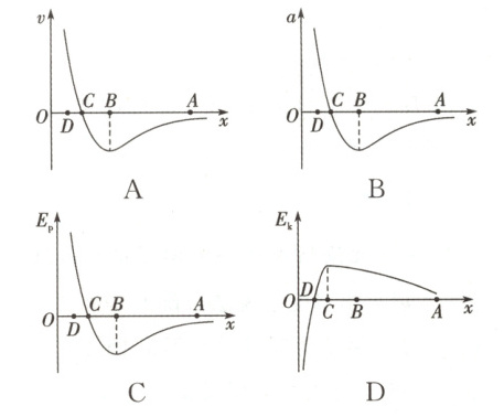 12. 如图所示,将甲分子固定在坐标原点$O$,乙分子位于$x$轴上,甲分子对乙分子的作用力与两分子间距离的关系如图中曲线所示。$F>0$时作用力表现为斥力,$F<0$时作用力表现为引力,$A$、$B$、$C$、$D$为$x$轴上四个特定的位置,现把乙分子从$A$处由静止释放,设两分子间距离很远时,$E_p = 0$。下列选项中分别表示乙分子的速度、加速度、势能、动能与两分子间距离的关系,其中可能正确的是 (