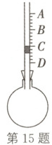 15.C 解析:此简易温度计是利用气体的热胀冷缩原理制成的,温度升高时,烧瓶内气体膨胀,有色水柱上升;温度降低时,烧瓶内气体收缩,有色水柱下降,已知A、D间的测量范围是20~80℃,可得A对应温度为80℃,D对应温度为20℃;A、D间刻度均匀分布,每格表示$\frac {80℃-20℃} {15}=4℃$,则有色水柱下端所示温度为20℃+3×4℃=32℃,选项C正确。