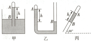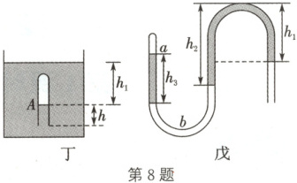 8.解:在图甲中,以高为h的液柱为研究对象,由二力平衡知$p_甲S + \rho ghS = p_0S$,所以被封闭气体的压强$p_甲 = p_0 - \rho gh$。在图乙中,以B液面为研究对象,由平衡方程$F_上 = F_下$,有$p_AS + \rho ghS = p_0S$,解得被封闭气体的压强$p_A = p_0 - \rho gh$。在图丙中,仍以B液面为研究对象,有$p_A' + \rho gh\sin 60^{\circ} = p_0$,所以被封闭气体的压强$p_A' = p_0 - \frac{\sqrt{3}}{2} \rho gh$。在图丁中,以液面A为研究对象,由二力平衡得$p_T S = (p_0 + \rho gh_1)S$,所以被封闭气体的压强$p_T = p_0 + \rho gh_1$。在图戊中,从开口端开始计算:右端为大气压$p_0$,同种液体同一水平面上的压强相同,所以b气柱的压强$p_b = p_0 + \rho g(h_2 - h_1)$,而a气柱的压强$p_a = p_b - \rho gh_3 = p_0 + \rho g(h_2 - h_1 - h_3)$。