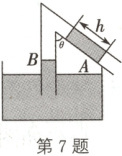 7.BD 解析:以A管中的水银柱为研究对象,则有$pS + h\cos \theta S = p_0S$,B管内气体的压强$p = p_0 - h\cos \theta$,显然$p < p_0$,由上可得B管内水银面要比槽内水银面高出$h\cos \theta$,选项BD正确,AC错误。