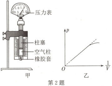 (3)若橡胶套内的气体不可忽略,设橡胶套内的气体体积为$V_0$,则有$p(V + V_0)=C$,可得$p = \frac{C}{V + V_0}·\frac{1}{V} = \frac{C}{V_0}·\frac{1}{V + \frac{V}{V_0}}$,可知$p - \frac{1}{V}$图像上点与原点连线的斜率为$k = \frac{C}{1 + \frac{V_0}{V}}$,故随着$\frac{1}{V}$的增大,$p - \frac{1}{V}$图像的斜率逐渐减小。