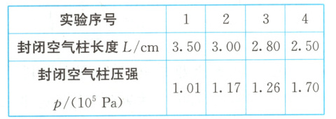 (2)若实验数据无误,则每组数据的$pL$乘积应该近似相等,由表中数据可知,前3组数据的$pL$乘积约为$3.5×10^{5} cm· Pa$,但第4组数据的$pL$乘积约为$4.3×10^{5} cm· Pa$,可知第4组数据有误。