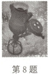 8.D 解析:开始时机内气体温度为$T_{1}=(127 + 273)K = 400K$时,体积为V,降温发生等压变化,当温度降为$T_{2}=(27 + 273)K = 300K$时,这部分气体的体积为V',根据盖-吕萨克定律有$\frac{V}{T_{1}}=\frac{V'}{T_{2}},$解得$V'=\frac{3}{4}V,$则降温后机内气体质量m'与开始时机内气体质量m的比值为$\frac{m'}{m}=\frac{V}{V'}=\frac{4}{3},$此时机内气体质量是开始时气体质量的$\frac{4}{3}$倍,选项D正确。